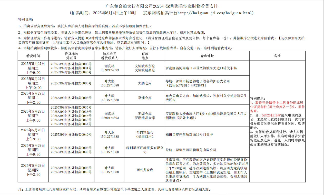 受深圳海关委托,我司定于2025年6月4日在京东网络拍卖平台(http://haiguan.jd.com/haiguan.html)在线按现状公开拍卖以下标的: