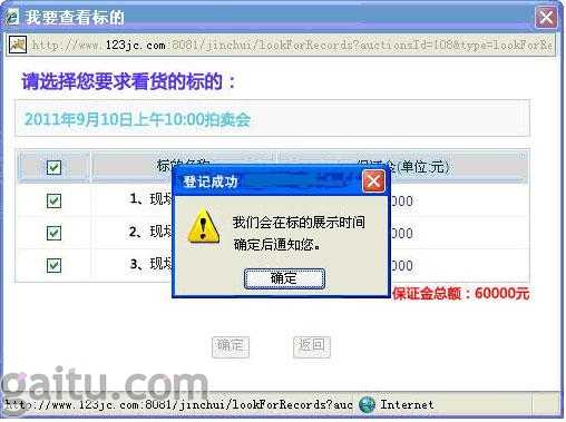 硬件要求:P4以上的电脑,15寸及以上的显示器,IE7及以上的浏览器,1M及以上的网络速度,耳麦或音箱、建议分辨率1024*768或更高. 特别说明:我司网络拍卖平台采用金槌拍卖系统(深圳市金槌拍卖行有限公司注册会员即为我司会员); 看货、竞买登记功能正在完善中,暂时不能使用,客户需要来我司现场办理登记手续(提供资料:身份证、交款凭证、用户名、手机号及竞买的标的); 办理竞买登记时,看货保证金自动转为竞买保证金,不足部分及时补足差额.。 和合网上拍卖教程 1、竞买人申请参拍 1.1竞买人登陆拍卖企业网站,浏览拍卖会公告:  1.2 点击我要查看标的、办理竞买登记手续按钮会提示登陆,未注册请先注册:  1.3点击立即注册,打开注册页面并填写信息,回答三个问题不一定要如实回答,只要你记住问题的答案即可,以后可以凭